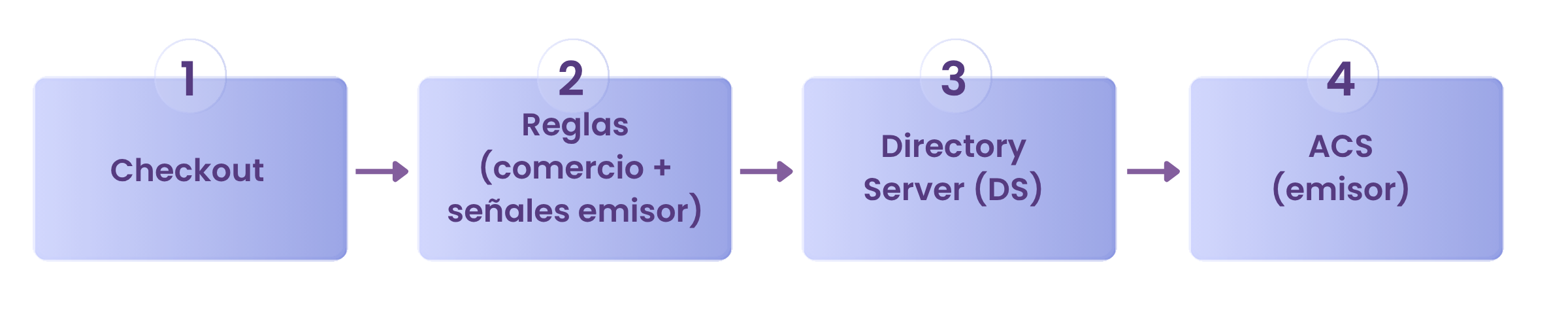 Dominios emisor, comercio/adquirente y interoperabilidad (Directory Server/ACS). Permite que el emisor evalúe riesgo y decida desafío, manteniendo interoperabilidad entre marcas.