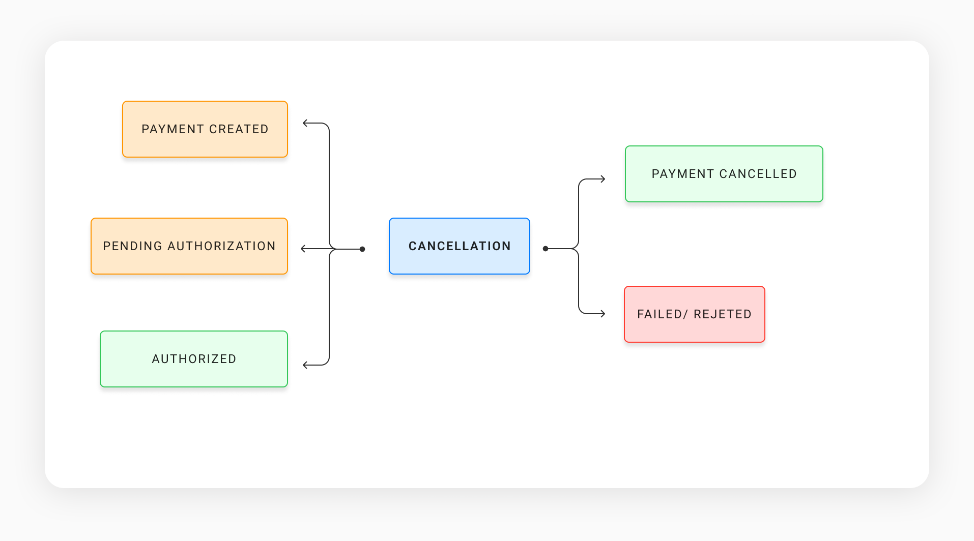- Puede ser cancelado directamente antes de autorizarse. Transición: Created → Cancelled.