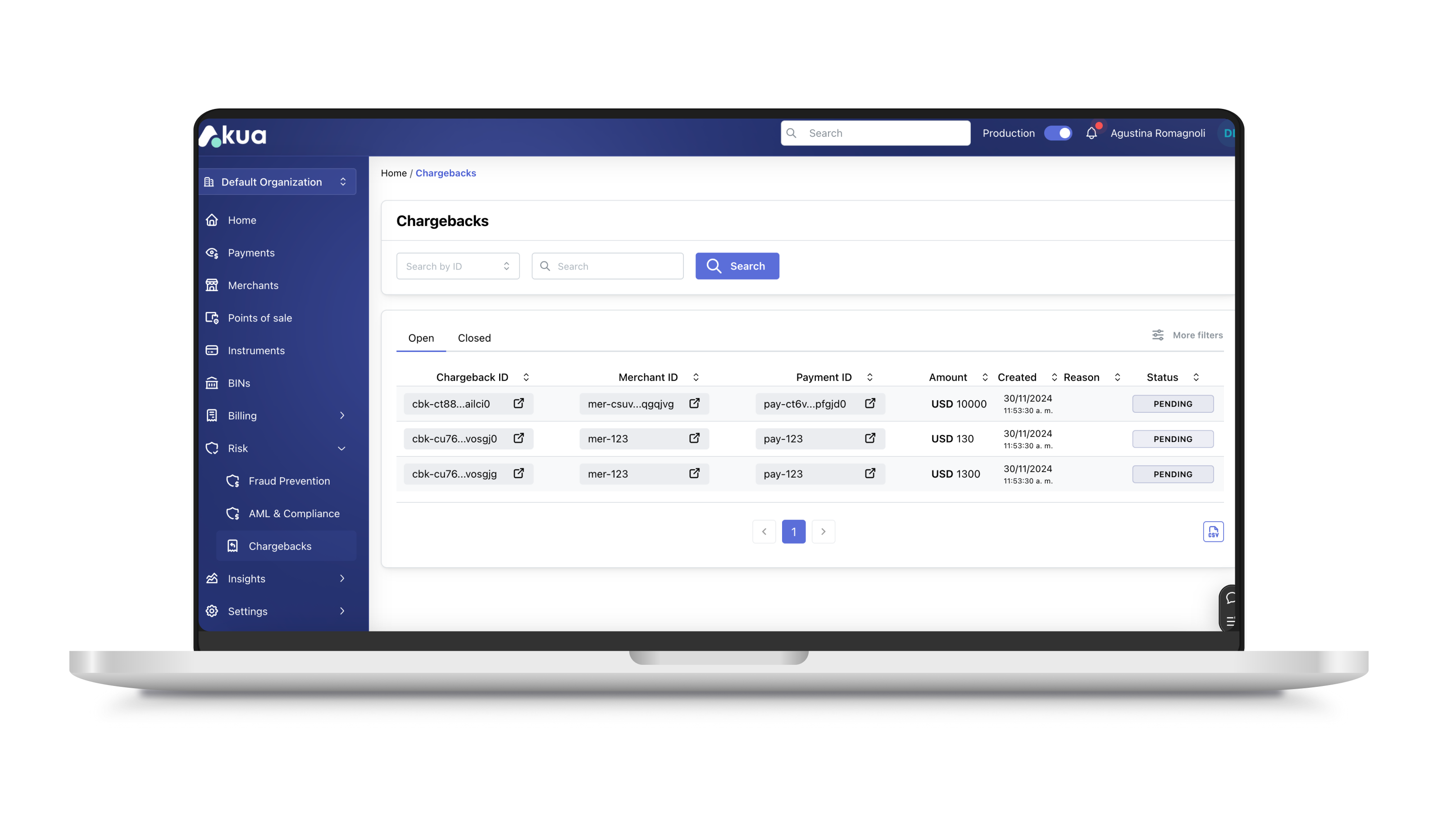 Para gestionar un chargeback, ingresa a la sección Chargebacks dentro del módulo Risk en el dashboard de Akua. Desde allí, podrás visualizar y administrar todos los casos abiertos.