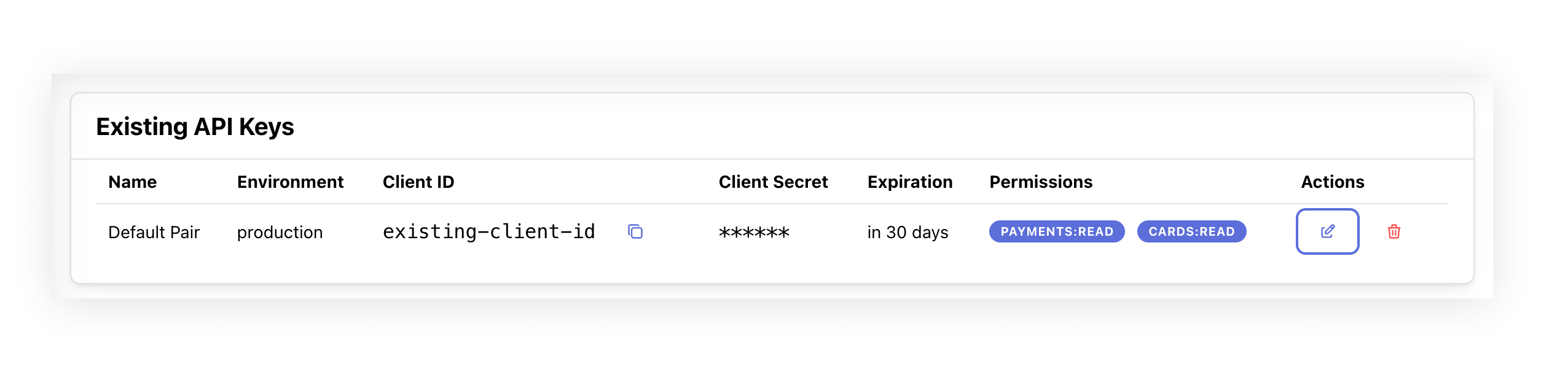 PAYMENTS:READ,CARDS:READ). - Expiración: Periodo de validez de la clave (ej. "30 días").