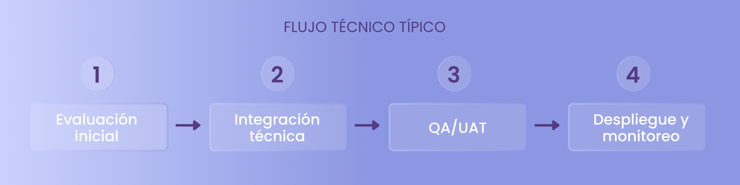 Evaluación inicial → integración con 3DS Server/MPI → QA/UAT → despliegue por etapas y monitoreo → ajuste de reglas y soporte.