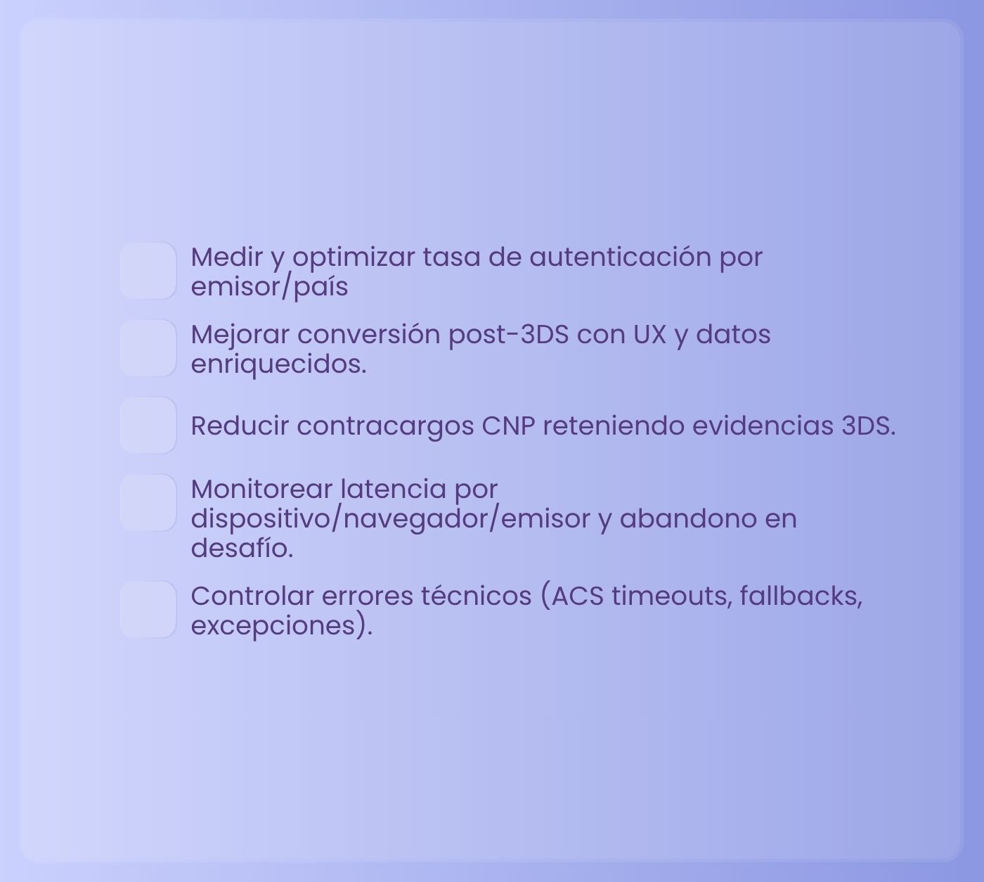 Autenticación exitosa, conversión post-auth, aprobaciones por emisor, tiempo de autenticación, abandono en desafío, contracargos.