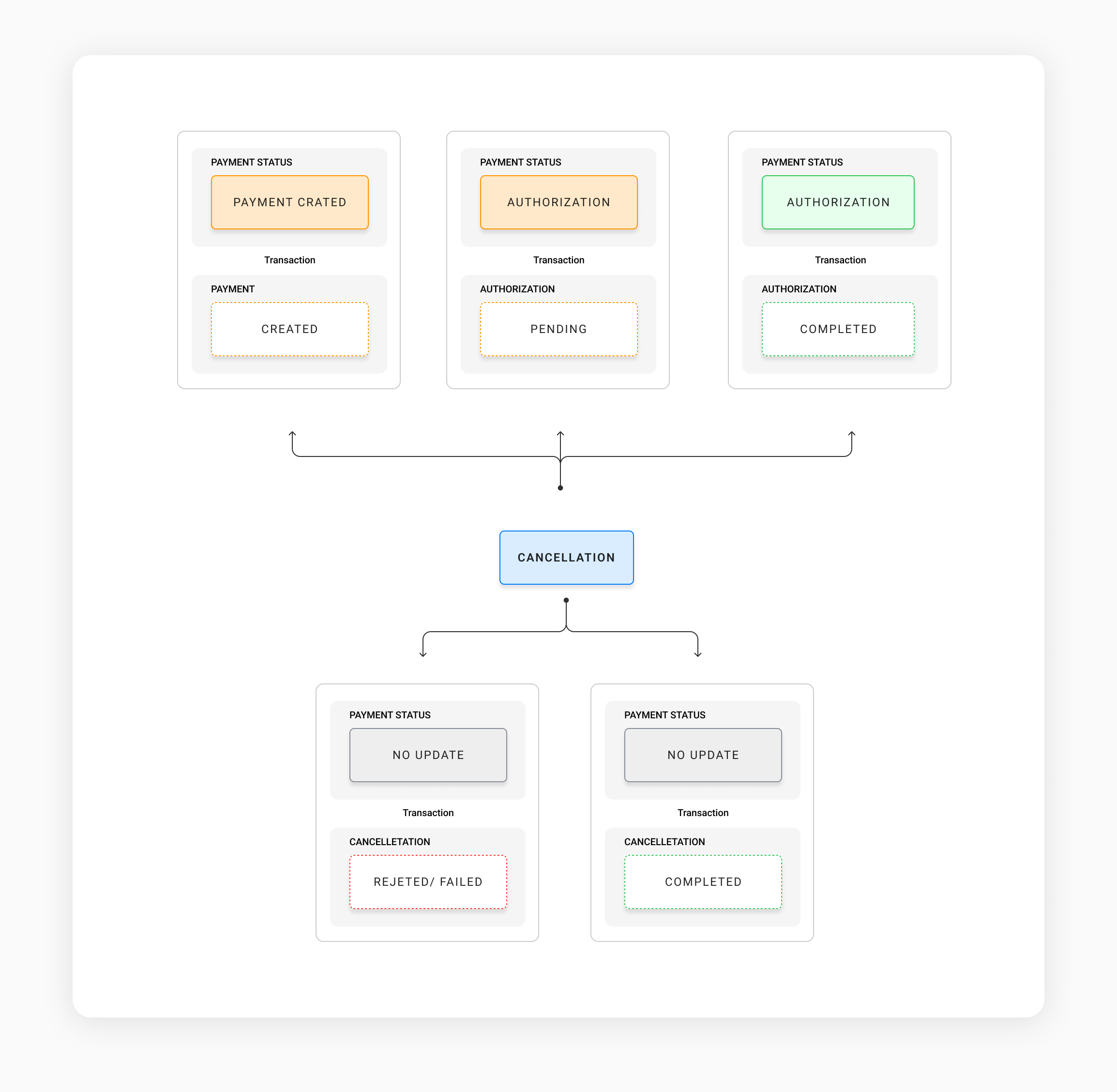 - Puede ser cancelado directamente antes de autorizarse. Transición: Created → Cancelled.