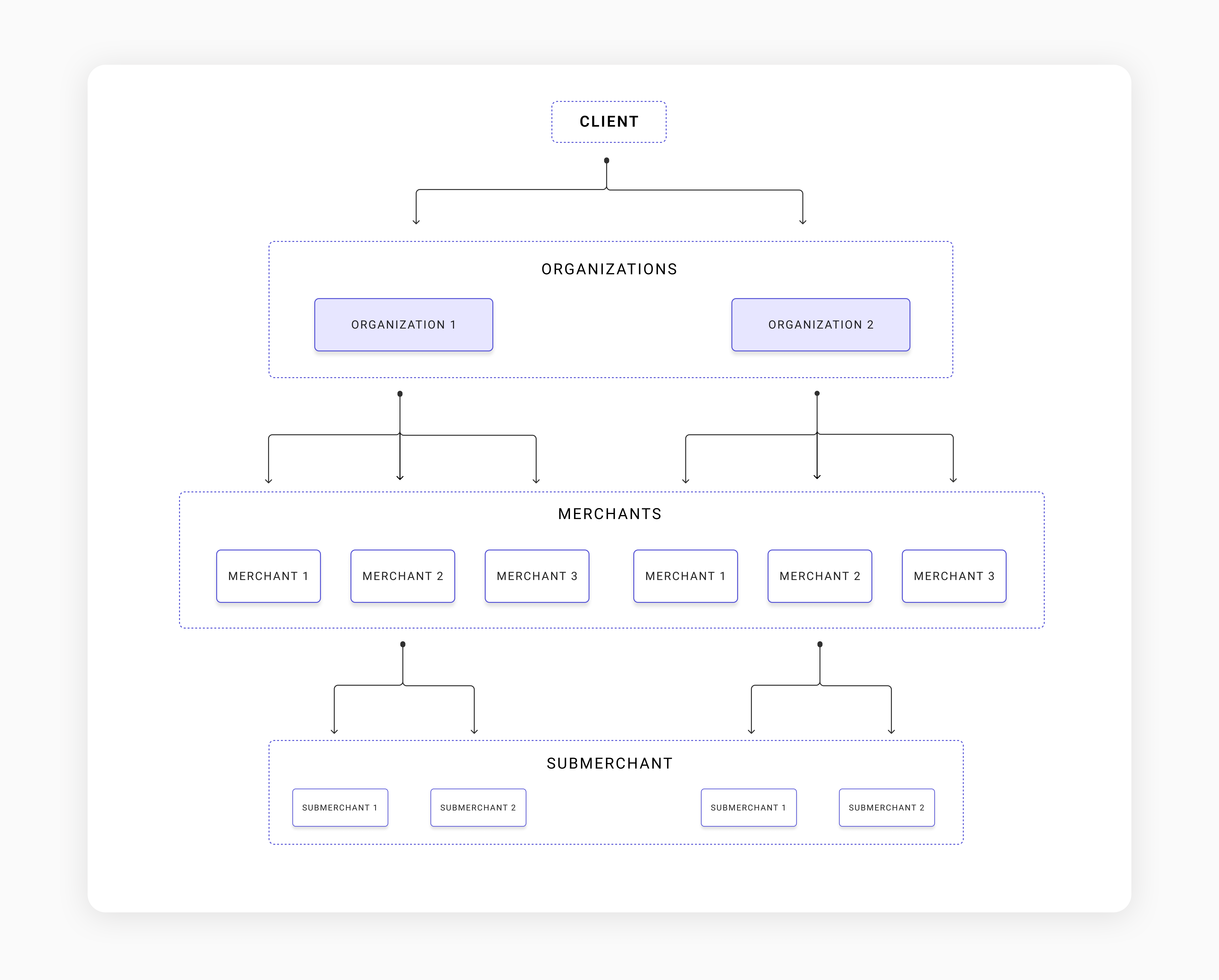 Es un forma lógica que tienen los clientes de organizar los diferentes merchants. Por defecto, un cliente al darse de alta va a tener una organización “default” la cual va a agrupar todos los merchants que se requiera. Se pueden crear todas las organizaciones que sean necesarias por parte del cliente.